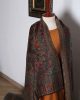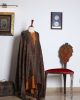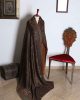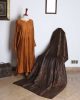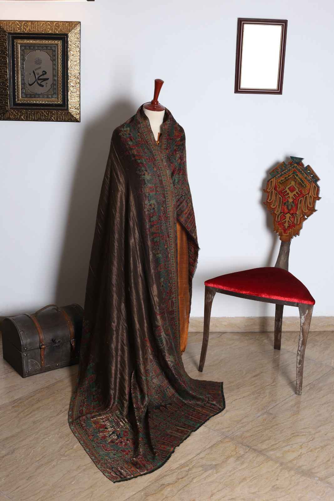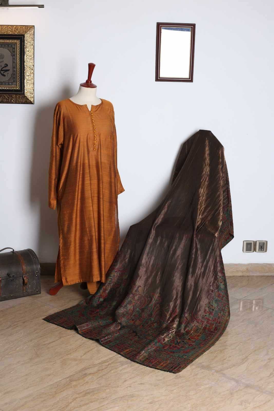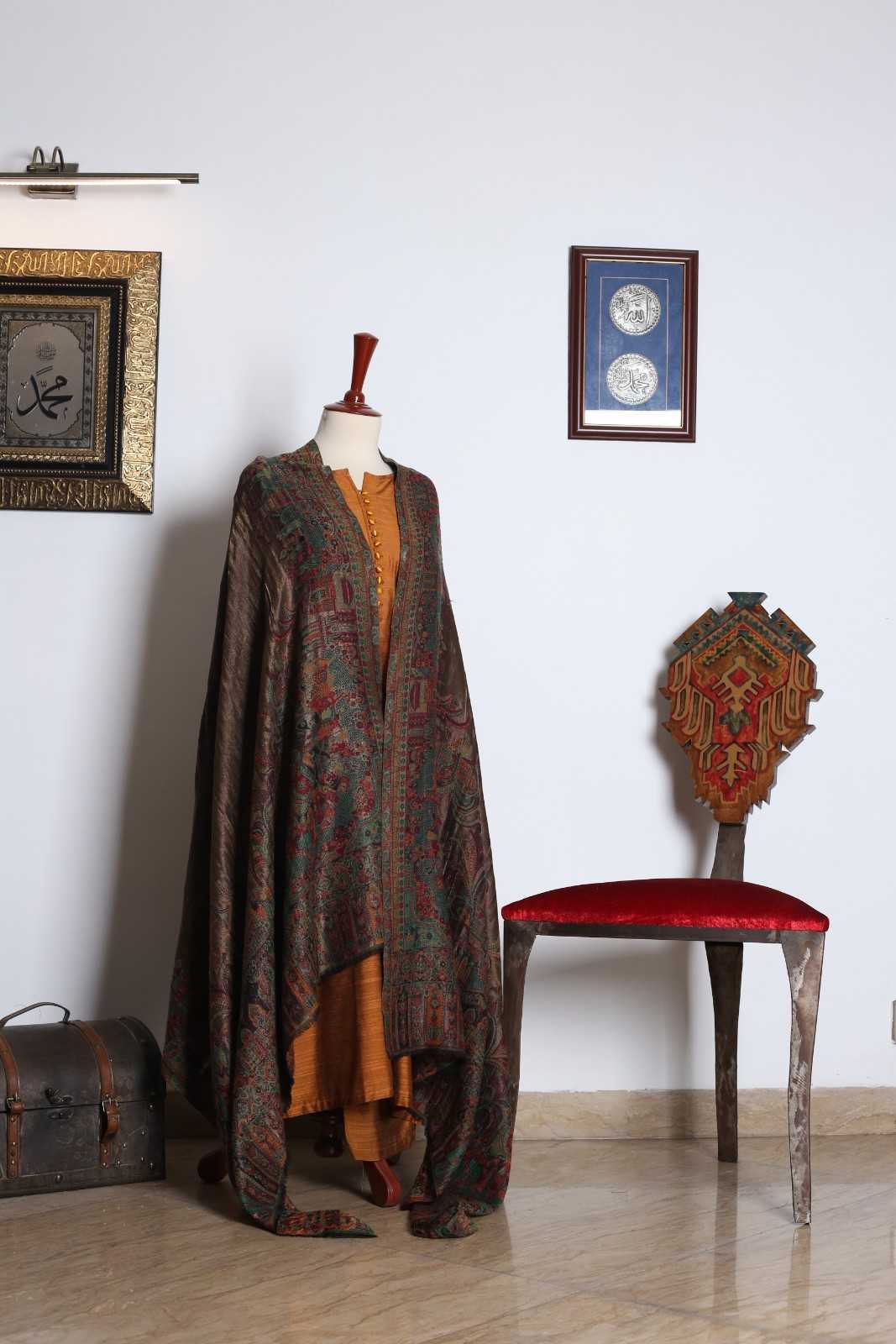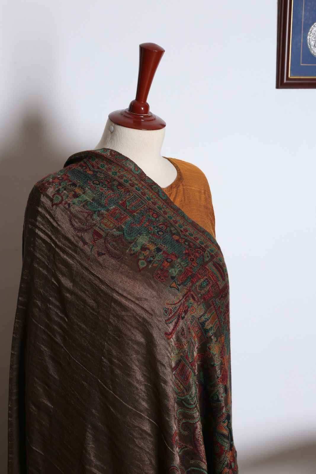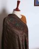 The shawl in the image appears to be a luxurious, silk shawl with a rich, dark brown color. It is adorned with intricate embroidery in gold, silver, and other colors, creating a stunning and elegant design. The shawl’s texture looks soft and smooth, suggesting a high-quality fabric. It is likely a traditional shawl from Pakistan or a similar region, given the intricate embroidery and the use of silk.
